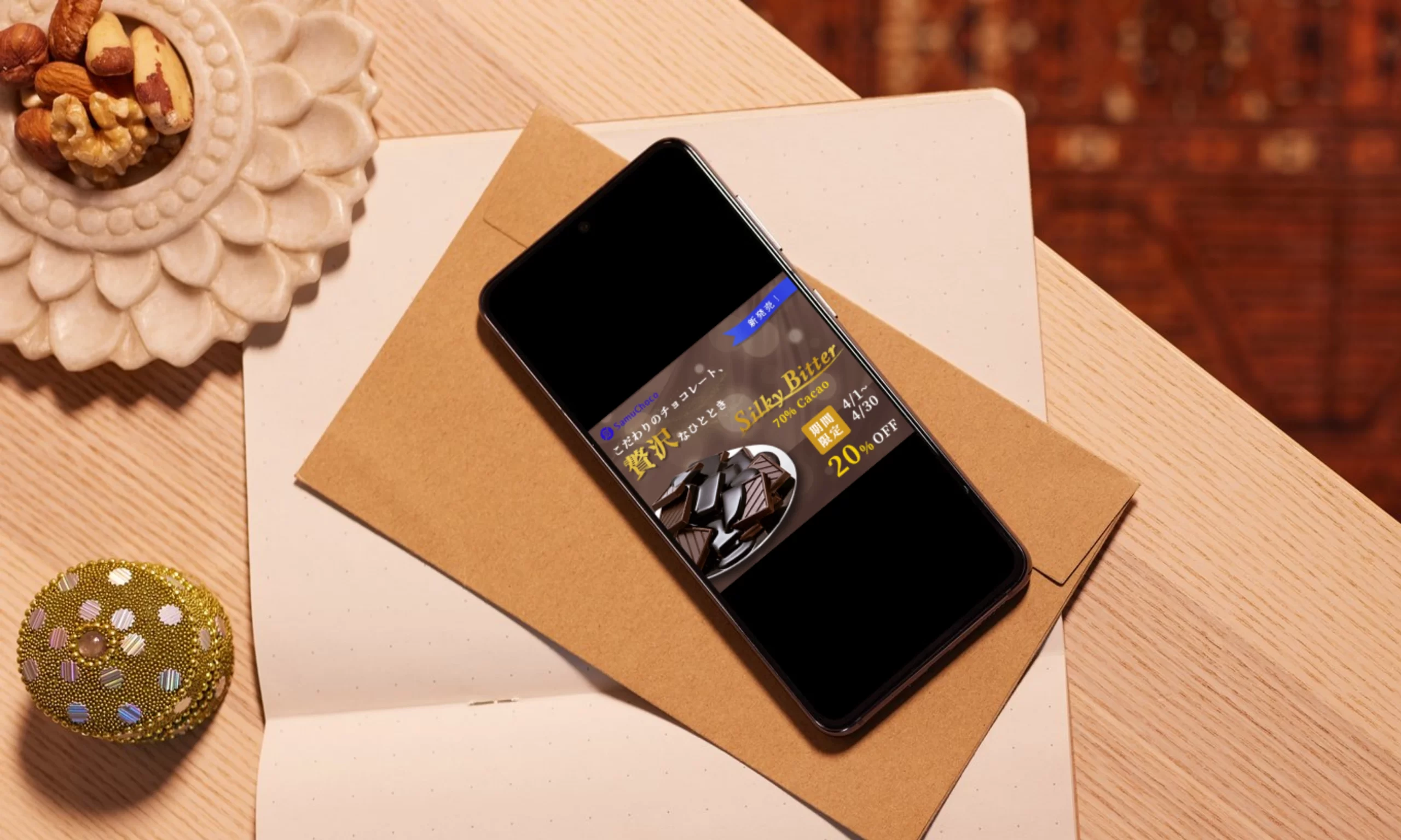 商品イメージを的確に伝えるため、リッチで上質な印象を与えるチョコレートの写真を中心に配置しました。