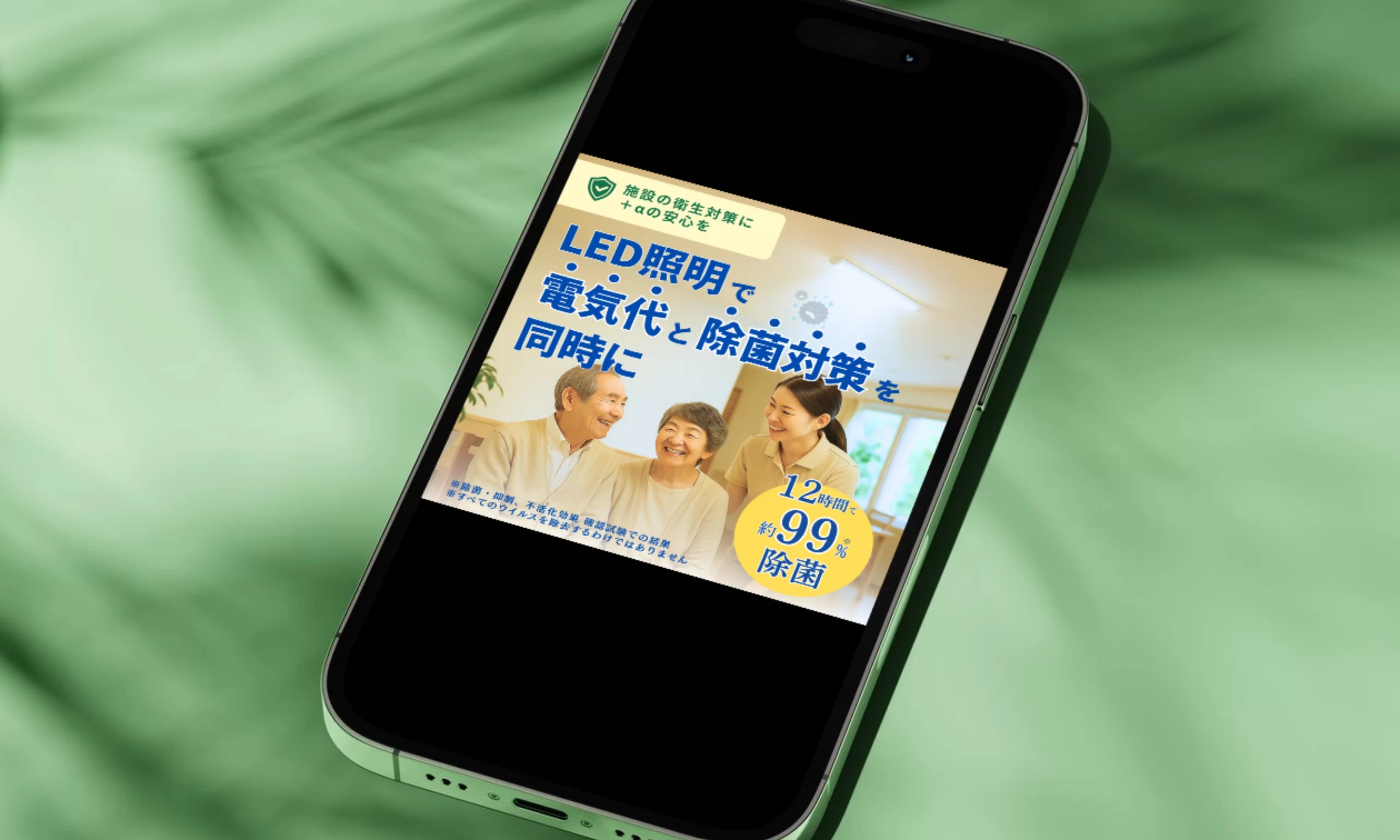 - 実際の施設ホール写真に暖色ライトを当て、入居者とスタッフの安心感を演出。